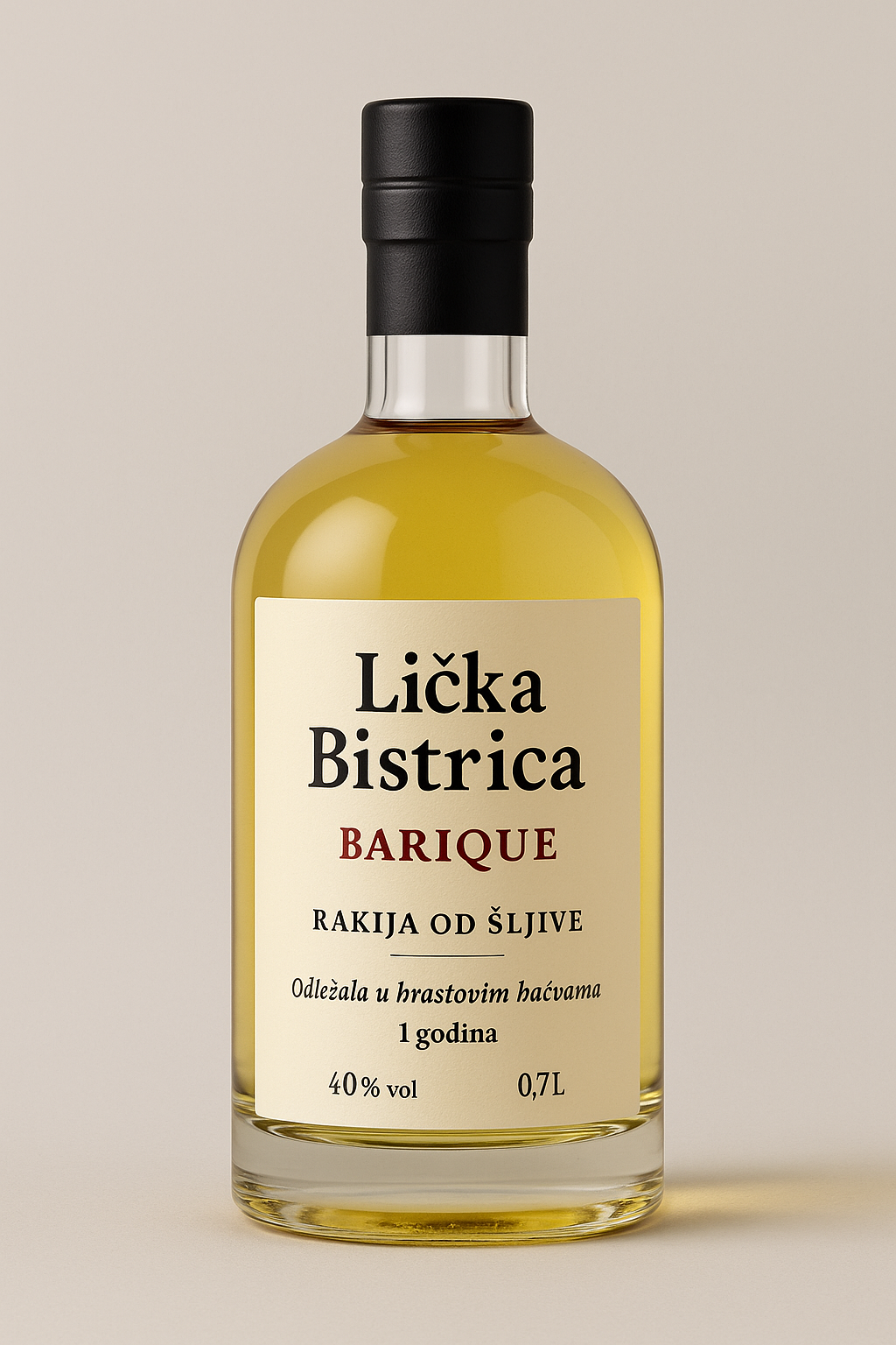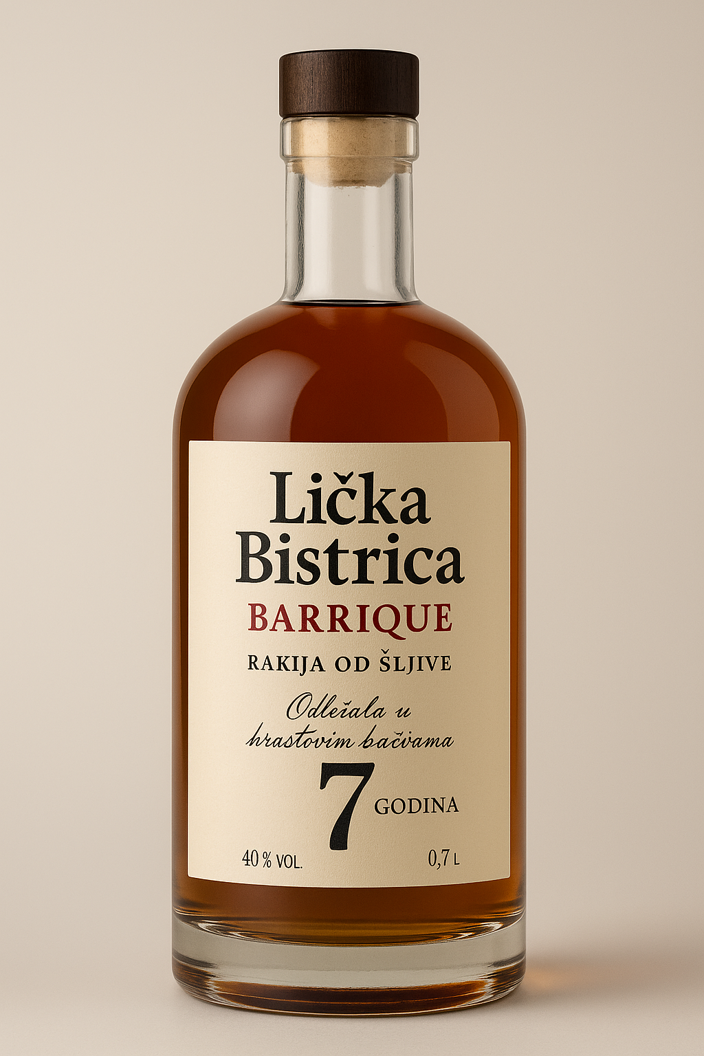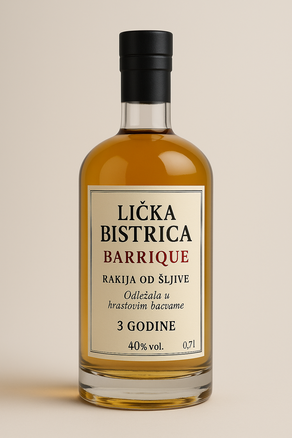 Tri godine zrenja u srednje tostiranim barrique bačvama od slavonskog hrasta daju ovoj rakiji toplinu, punoću i začinski karakter. Prirodna voćnost ličke bistrice skladno se spaja s blagim drvenastim tonovima, dodirom vanilije i mekom završnicom. Ovo je rakija za one koji vole ravnotežu – ni premlada ni pretvrda, s izraženom osobnošću i dubinom.